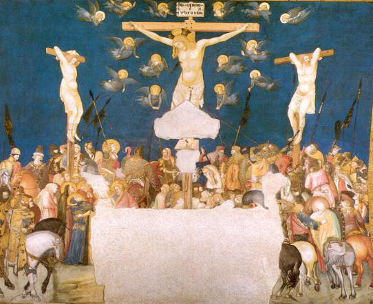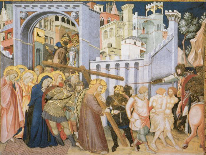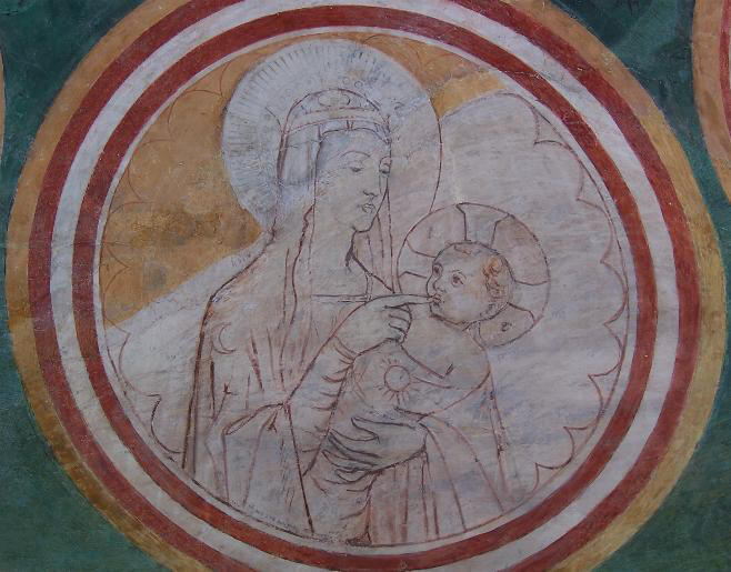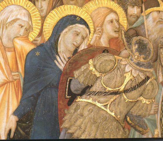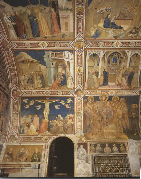 esso si trasforma in manina. L'incontro di Maria con Santa Elisabetta ci riporta all'inizio della nostra salvezza e ci induce a meditare sull'umiltà e il servizio che Maria, pur se all'inizio della sua incredibile gravidanza, ci indica andando ad aiutare la cugina Elisabetta incinta. Ed ecco il Bimbo nasce in una stalla mentre Giuseppe medita perplesso sul destino tanto grande che Dio gli ha preparato. I re maggi vengono con doni ad adorarlo e si prostano a turno a ricevere sul capo la carezza di Gesù. Arriva il giorno della presentazione al tempio e il vecchio Simeone riconosce il Figlio divino che attendeva per poter morire e con dolore predice alla Vergine santissima che una spada trapasserà il suo cuore. La spada è più tagliente di quanto Maria potesse immaginare: suo Figlio è sulla croce accompagnato dal dolore di Giovanni e delle donne, ma la festa degli angeli intorno alla sua croce ne celebra la gloria e San Franceso seguito da Sant'Antonio e da un altro francescano si inginocchiano per ringraziare il Cristo del suo amore ed adorare Dio. Sul trono della maestà divina sorretto da quattro angeli ci appare la Madonna con il bambino benedicente (dipinta da Cimabue), alla sua destra San Francesco con i piedi scalzi mostra le sue stimmati e stringe al cuore il libro della vita. Sotto la Maestà cinque beati francescani pregano commossi . |