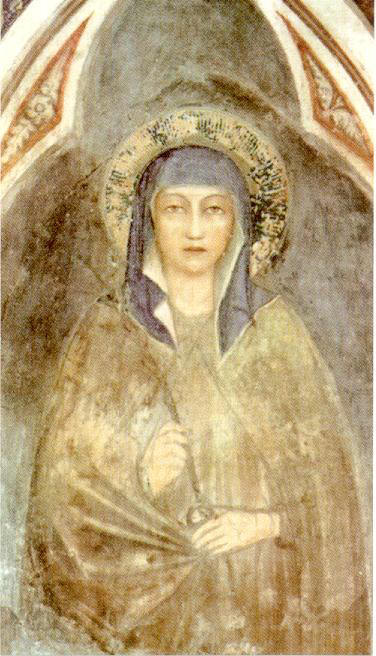 ![]() Ci fermiamo davanti all'affresco che ci parla della vita della santa e ci accostiamo al bellissimo affresco di un pittore umbro che ritrae il viso giovane di Chiara con un realismo tale che a noi sembra di poterle parlare. |
